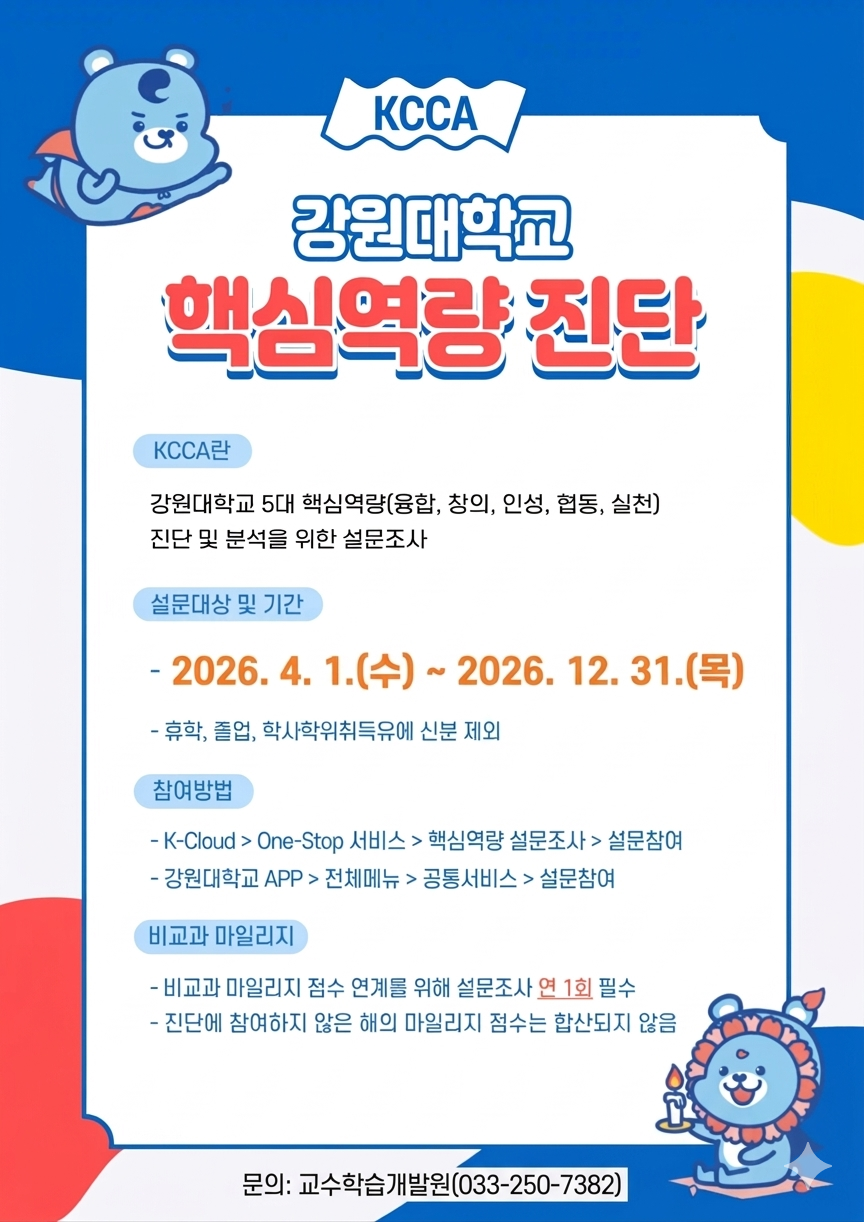 2026학년도 재학생(1~4학년) 강원대학교 핵심역량 진단(KCCA) 시행 및 참여 안내