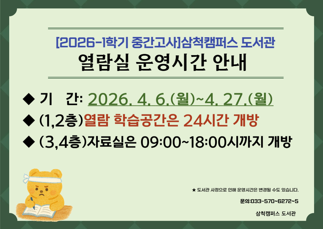삼척캠퍼스 도서관 1학기 중간고사 기간 학습·열람공간 연장개방 운영 안내